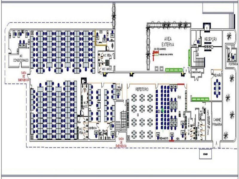 Térreo + 2 andares, atualmente compartimentados em posições de trabalho (capacidade para 600 posições) e salas de aula/treinamento/reunião;
