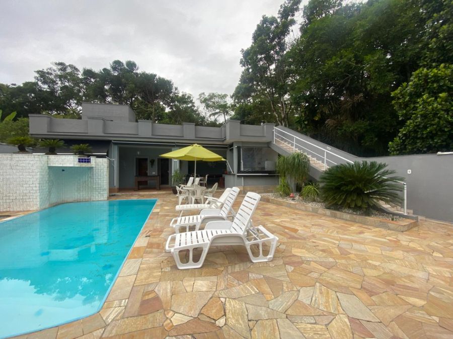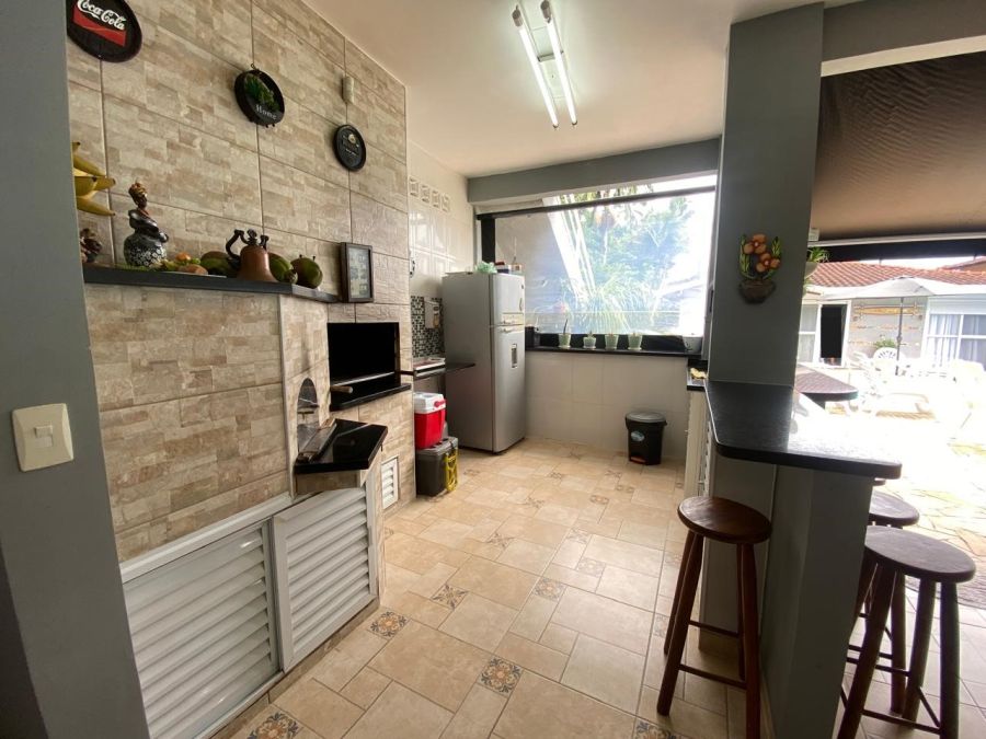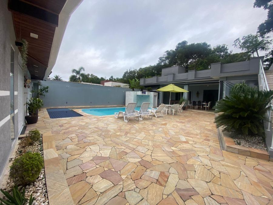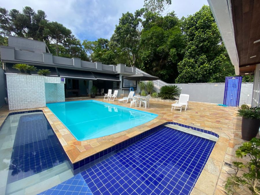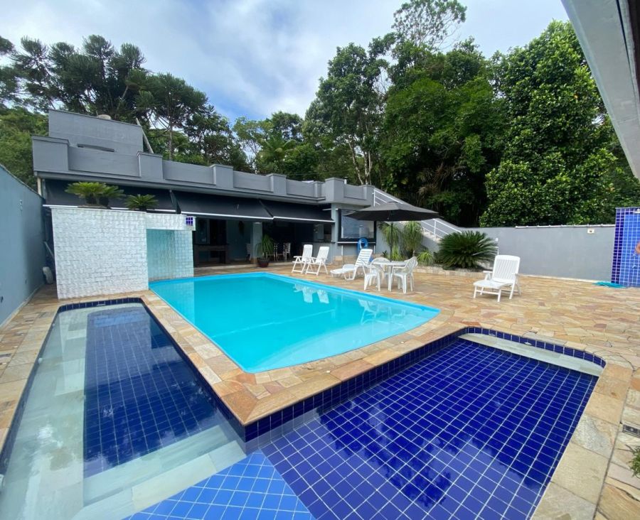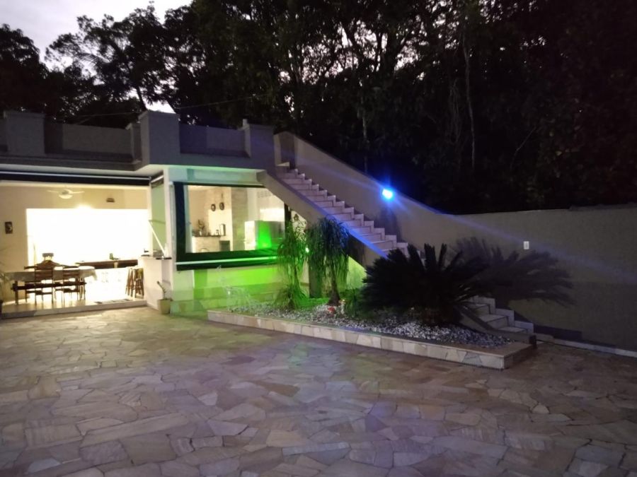A residência possui 4 dormitórios, sendo 2 suítes, conta com sala espaçosa para três ambientes, lareira, cozinha com armários, lavanderia e um espaço gourmet completo, piscinas, sauna.