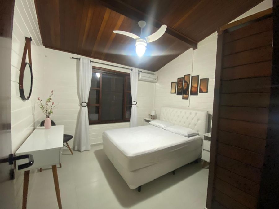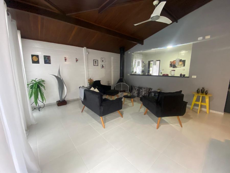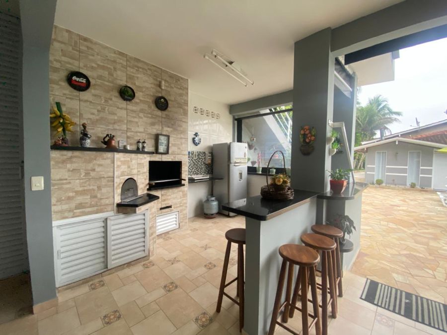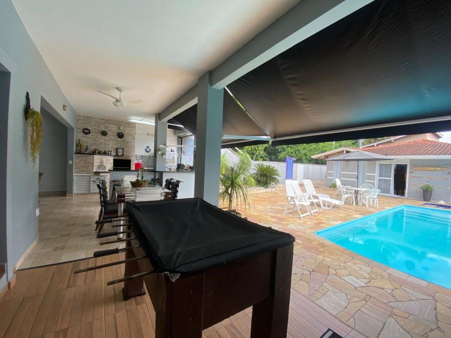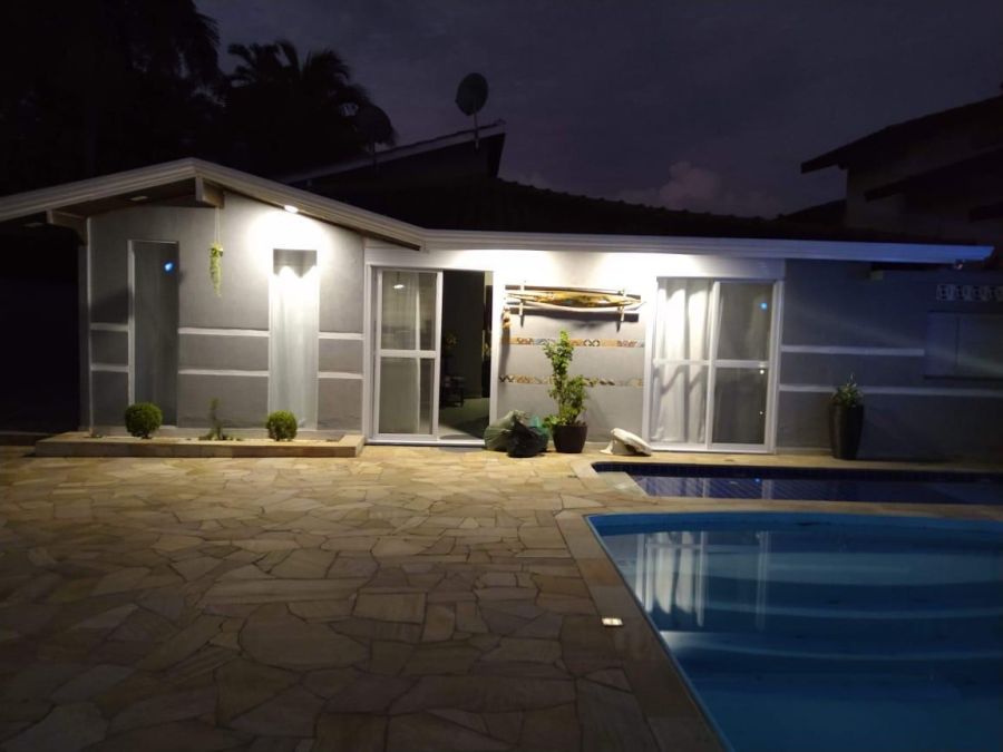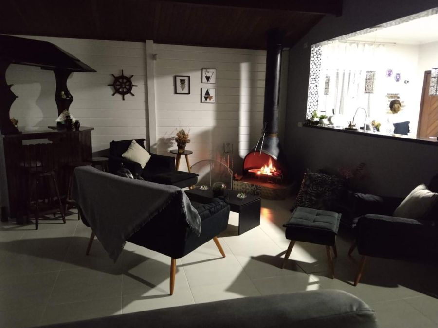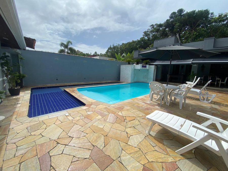 A residência possui 4 dormitórios, sendo 2 suítes, conta com sala espaçosa para três ambientes, lareira, cozinha com armários, lavanderia e um espaço gourmet completo, piscinas, sauna.